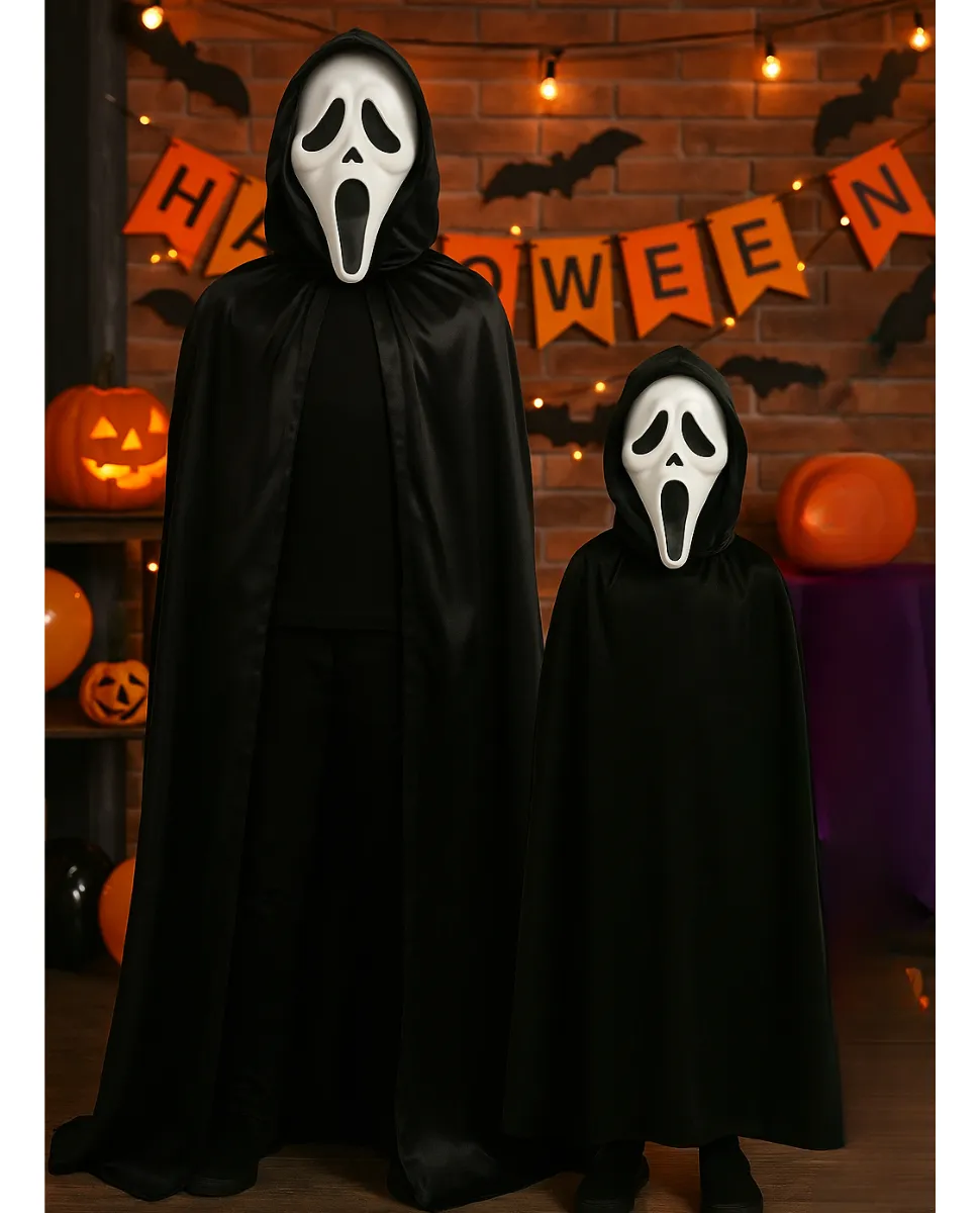 Fantasia Ghostface com Máscara e Capa Longa – Infantil e Adulto | Terror, Halloween, Pânico
