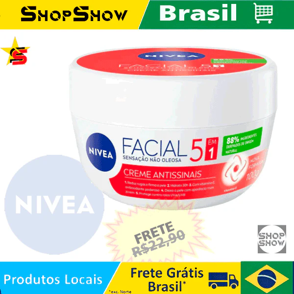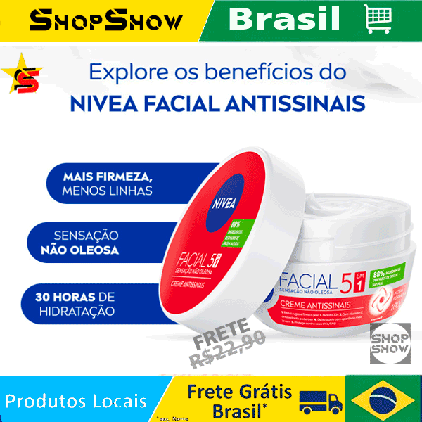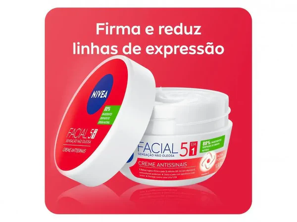 O Creme Facial Antissinais NIVEA é um hidratante facial diário que reduz sinais e linhas de expressão. Com uma fórmula leve e de rápida absorção, este creme proporciona hidratação intensa por até 30 horas e o mais importante: sem deixar a pele com aspecto oleoso. Por possuir ingredientes hidronutrientes e vitamina E, o Creme Facial Antissinais NIVEA previne rugas, melhora a cicatrização e ainda protege a pele contra os raios UVA/UVB. Além disso, sua fórmula exclusiva firma a pele e ainda reduz as linhas de expressão, deixando-a muito mais jovem e saudável. Benefícios e diferenciais: Hidratação intensa sem deixar a pele oleosa. Melhora a cicatrização. Fórmula leve e de rápida absorção. Deixa a pele mais firme e reduz as linhas de expressão.